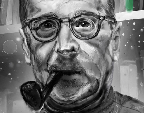 Passi rimbombano nella nebbia. Un canale navigabile e una banchina si perdono nel nulla. Un filare di pioppi si intravede e il suono di qualche chiatta si sente in lontananza. Scorgiamo l’insegna di una locanda, entrando il fumo ci avvolge ed è difficile distinguere i volti degli uomini che bevono, discutono o giocano a carte. Uno di loro è seduto in disparte, con un bicchiere di cognac sul tavolino quasi terminato e una pipa accesa. Scrive continuamente su un quaderno a spirale, non ha neppure tolto l’impermeabile nell’impeto delle idee, nell’impellenza di fermarle sulla carta.