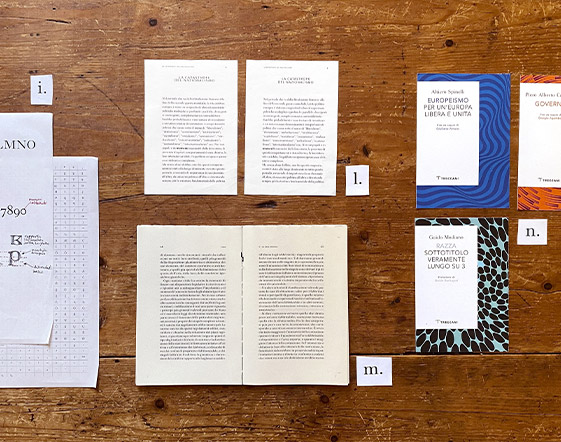 Studi di progetto. i. Analisi del carattere precedemente in uso. l. Bozze di impaginati interni, ogni soluzione è stampata su carta per valutarne la leggibilità. m. i sedicesimi del libro prima di essere rilegati e rifilati insieme alla copertina n. Studi di titolazioni per la collana “Voci”.