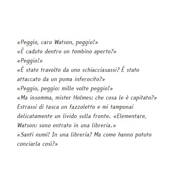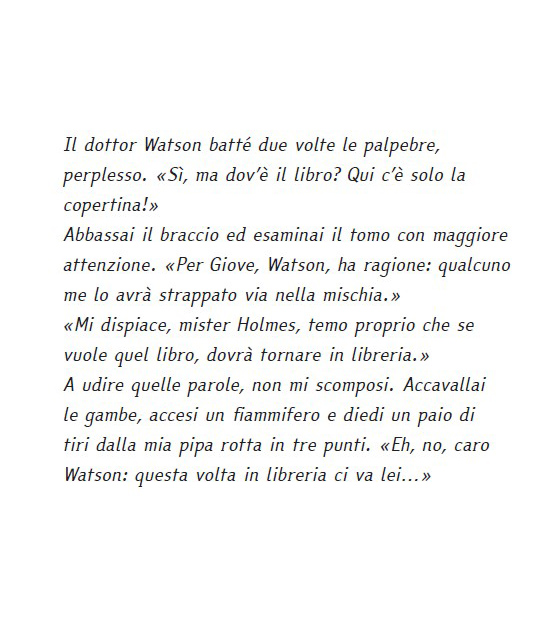 Ma partiamo dal principio! L’introduzione è di un illustrissimo personaggio che possiamo definire uno dei più famosi protagonisti della letteratura, risolutore di gialli e misteri: Sherlock Holmes, ideato dalla penna di Sir. Arthur Conan Doyle alla fine del XIX secolo. La sua bravura a risolvere enigmi e le sue capacità deduttive sono note e apprezzate da un pubblico vastissimo, si tratta infatti di un uomo dall’intuito formidabile, capace di correlare avvenimenti e misfatti, scovando il colpevole in men che non si dica. A suo dire, questa volta, è invischiato in un grosso problema di assalto alle librerie dove si è trovato suo malgrado coinvolto, per questo ha bisogno del suo fedelissimo collaboratore Watson, per poi passare la palla al lettore.