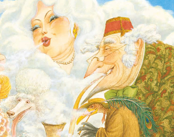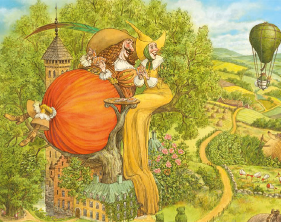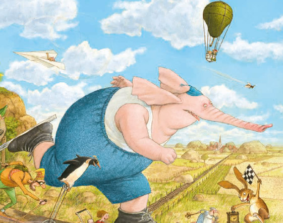 Non c’è pagina che non catturi lo sguardo invogliando a scoprire ogni minimo dettaglio, ognuno è parte della storia, ognuno rientra nel percorso del lettore, o meglio, dell’osservatore. Troviamo mongolfiere fatte con una pera legata ad una tazzina, un arcobaleno che esce da uno strano marchingegno messo in moto, e che dire della mucca che con una lingua lunghissima fa da ponte a delle chiocciole che stanno scendendo da una foglia? Si trova davvero di tutto, ogni volta che si sfoglia una pagina si resta a bocca aperta. Questo libro, oltre ad essere un libro brulicante, come i nostri "cerca e trova", è un libro quasi senza parole.