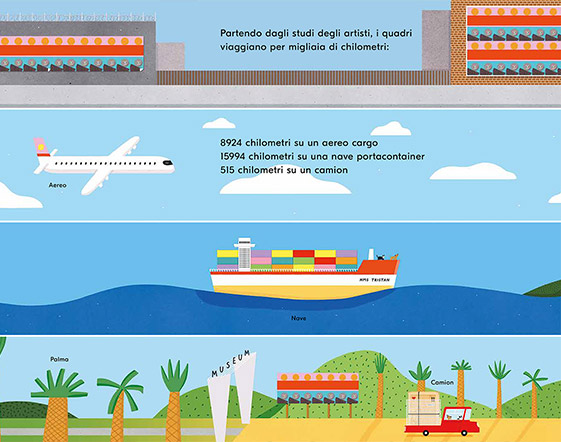 La grande innovazione di questo libro è infatti farci capire come funziona l’arte contemporanea senza spiegarcelo: si comincia dalle pagine con lo sfondo a colore pieno e forti contrasti cromatici che accompagnano lungo tutto il percorso, per poi comprendere via via il processo di creazione e di realizzazione di un’opera e della sua collocazione, che mette in risalto la funzione di ogni persona. Ciascuno è un anello indispensabile di una catena senza cui la mostra avrebbe difficoltà a prendere vita e a rimanere nella memoria delle persone che la visiteranno. Dietro l’allestimento pratico, che spesso nasce dallo studio in miniatura degli spazi del museo, scopriremo che ci sono delle figure che curano la comunicazione e la raccolta di materiali, altre che fanno nascere i libri che ci portiamo a casa come ricordo, altre ancora che preparano attività di divulgazione per grandi e piccoli oltre che feste, o che semplicemente tengono d’occhio le opere perché nessuno le rovini e porti via o ne hanno cura durante i trasferimenti lunghissimi da un luogo all’altro. Eccoci così entrati, quasi per caso, nelle giornate e nella testa degli artisti e dei loro collaboratori, anche attraverso i termini e gli strumenti particolari usati da loro, utili ad arricchire il lessico dei bambini attentissimi ai particolari molto più che gli adulti: in ogni pagina gli oggetti più strani sono corredati di relativa nomenclatura. Il forte contrasto tra i colori e i contorni netti delle figure, oltre a tanti particolari simpatici, come gli animaletti che accompagnano gli artisti, rendono l’approccio al libro semplice e accattivante tanto da farci sentire gradualmente protagonisti della mostra, che fino alla fine vediamo nascere sotto i nostri occhi e della cui riuscita quasi ci si emoziona.