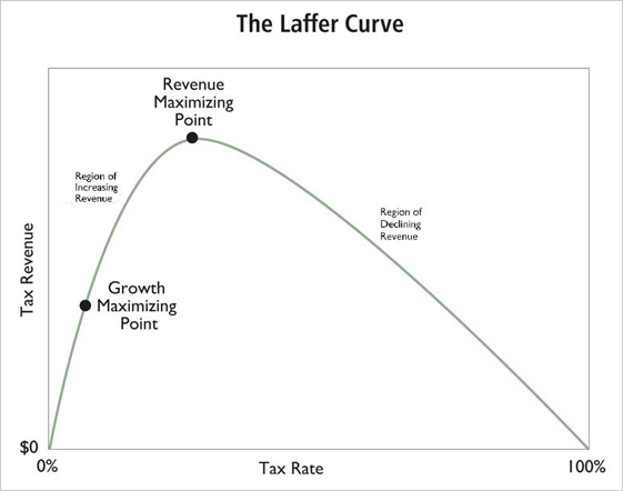 La risposta è ancora zero, perché in questo caso nessuno lavorerebbe più. Quindi - sostiene Laffer - fra questi estremi c'è una sorta di curva a campana, per cui man mano che le tasse vengono aumentate, aumenta il gettito. Poi il gettito arriva a un massimo, per cominciare subito dopo a decrescere fino - appunto - a tendere verso zero. Laffer - che era a pranzo con due uomini politici potenti - sosteneva che noi ci troviamo ora nella parte discendente di questa curva a campana per cui, riducendo le tasse, negli Stati Uniti, il risultato è che il gettito, invece di ridursi, aumenta.