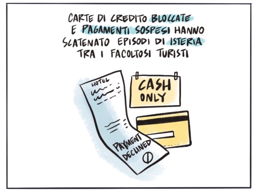 Saint Moritz, Grand Hotel, champagne e tutti gli optional extra-lusso. Tutto regolare, tutto bello, per alcuni ricchi turisti che vengono dalla Russia... non fosse che la carta è bloccata. Contanti?