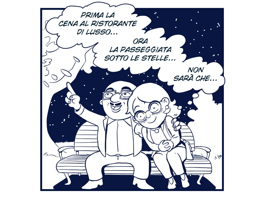 È tutto perfetto, a volte: l'atmosfera romantica, rischiarata appena da un bagliore di candele. Il cibo, buonissimo e non troppo pesante. Le parole sussurrate con la giusta intensità, e il giusto volume di voce. Già: niente sembra andare storto, in questa sera di San Valentino. E sotto la volta stellata, potrebbe accadere davvero di tutto.