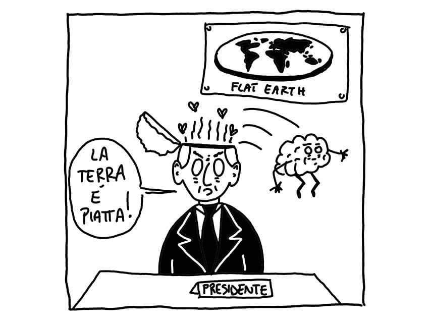 Ci immaginiamo che, al di là dello schermo, qualcuno ci stia guardando, per cogliere nelle nostre reazioni sintomi promettenti. "Eccone un altro che ci è cascato!", potrebbe dire il big brother che ha disseminato il web di esche tanto grossolane quanto succulente per molti, moltissimi esploratori. Scie chimiche, cospirazioni ad ogni dove e - su tutte - la madre di tutte le teorie: la terra è piatta. Non c'è assunto scientifico che tenga; non ci sono Copernico, Galileo o Newton che possano opporre a quest'idea alcun plausibile antidoto. La terra è una crêpe suzette o una piadina (a seconda che il terrapiattista sia parigino d'origine o di Cesenatico) alla deriva nel cosmo, fluttuante fra altri dischi monodimensionali in attesa di essere colonizzati da astronauti senza nessuna formazione scientifica ma volenterosi e soprattutto orgogliosamente refrattari a ogni "verità precostituita".