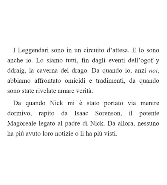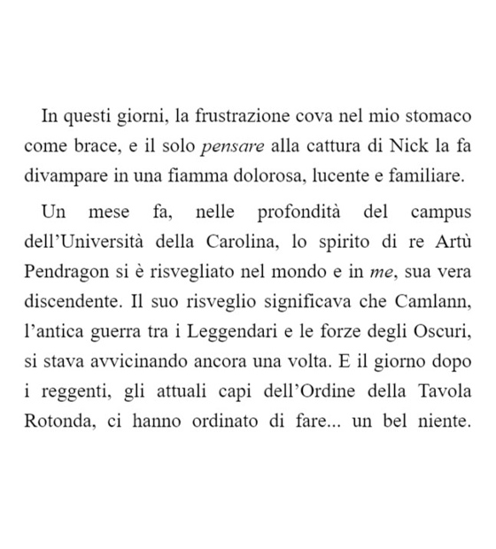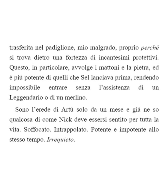 Sono l’erede di Artù solo da un mese e già ne so qualcosa di come Nick deve essersi sentito per tutta la vita. Soffocato. Intrappolato. Potente e impotente allo stesso tempo. Irrequieto