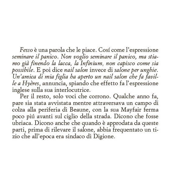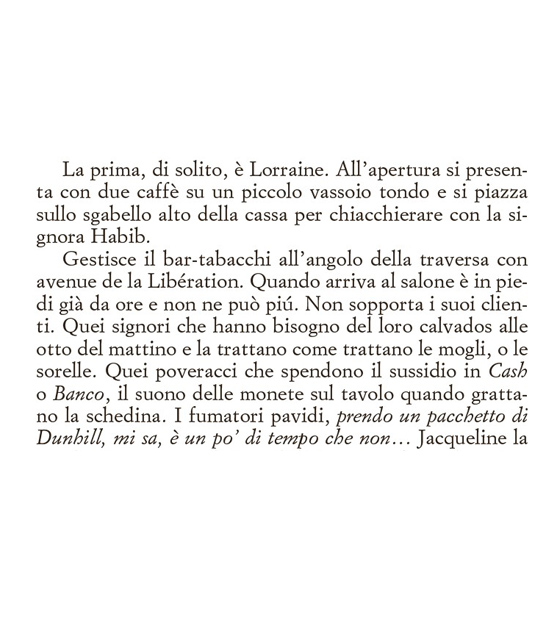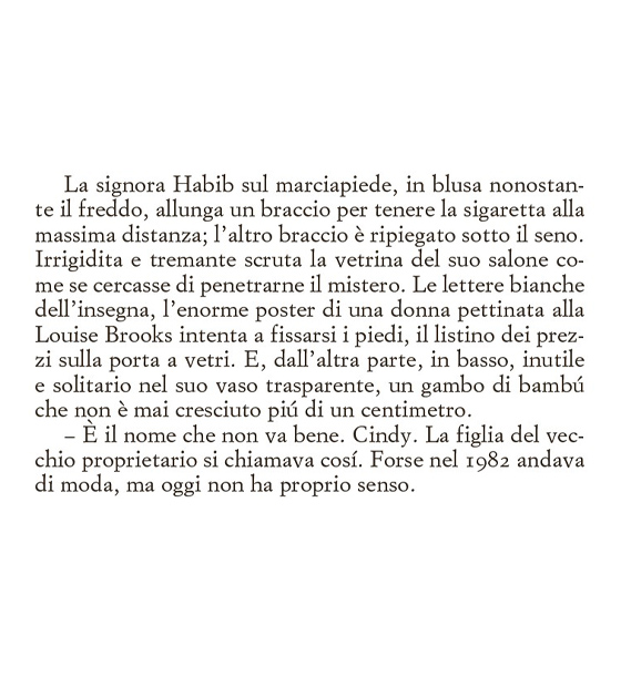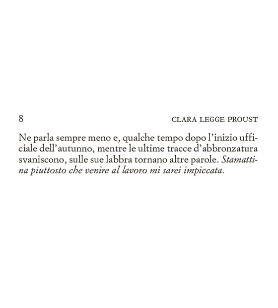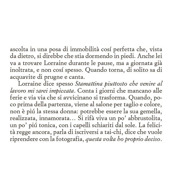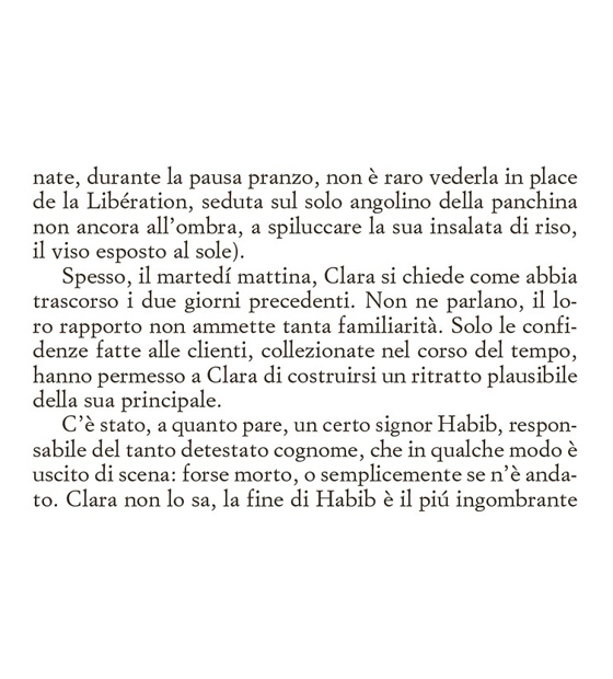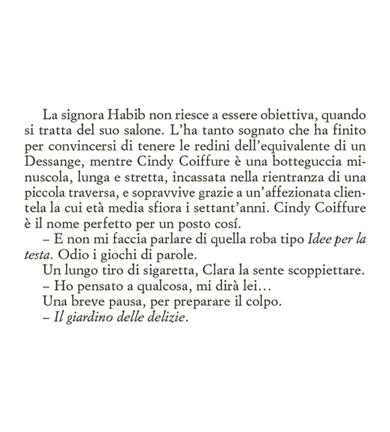 Clara non legge molto, non ha gusti letterari definiti e nel suo scaffale si possono trovare la biografia di Ibrahimović o libri sull’oroscopo. Non ha realmente degli hobby e sono anni che la sua vita è monotona, senza alcun particolare risveglio emozionale. Si alza la mattina, cerca di accarezzare il gatto che non ha mai ricambiato il suo affetto, si reca al salone in cui lavora tutto il giorno ascoltando battibecchi e chiacchiericci di vecchie signore, per poi tornare a casa da un fidanzato verso il quale non riesce più a provare attrazione.
