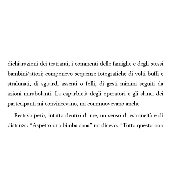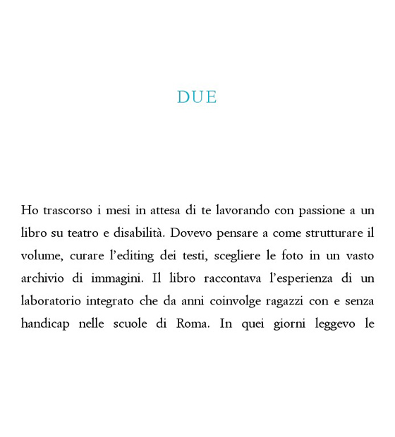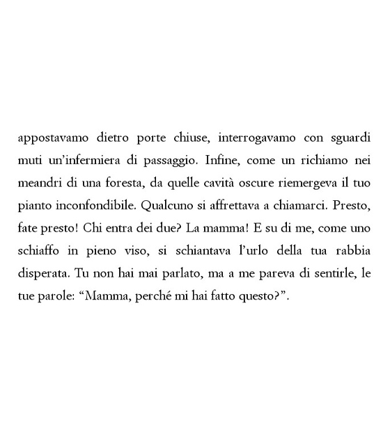 Quando hai un figlio disabile cammini al posto suo, vedi al posto suo, prendi l’ascensore perché lui non può fare le scale, guidi la macchina perché lui non può salire sull’autobus. Diventi le sue mani e i suoi occhi, le sue gambe e la sua bocca. Ti sostituisci al suo cervello. E a poco a poco, per gli altri, finisci con l’essere un po’ disabile pure tu: un disabile per procura.
