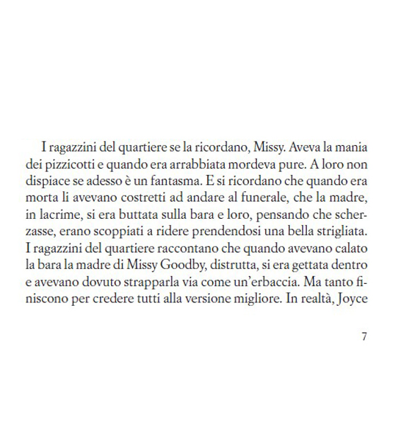 Giusto a ovest di Boston, giusto a nord dell’autostrada, il fantasma di Missy Goodby sonnecchia rannicchiato contro la rete metallica in un punto morto in fondo a Winter Terrace, con indosso una salopette ectoplasmatica