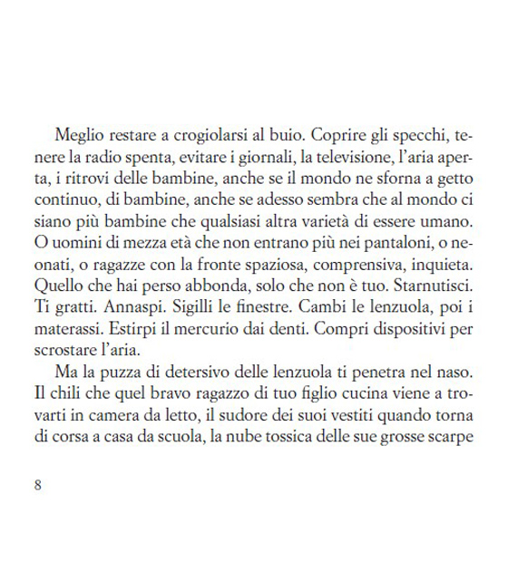 «Era un pensiero che ogni tanto gli passava per la testa ultimamente. Non era dolore, che avrebbe potuto travolgerlo in ogni momento, che come l’acqua piegava tutte le righe dritte e sbalestrava qualunque suo strumento di navigazione rendendolo inutile, bensì un pensiero razionale, distaccato: Non è orribile quello che mi è successo uno, due, tre mesi fa? È stato bruttissimo doverlo affrontare.»