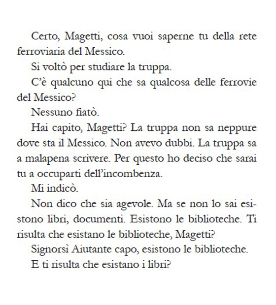 Tutto ha inizio ad Asti nel febbraio del 1944, dove Cesco Magetti presta servizio alla Guardia nazionale repubblicana Ferroviaria, nella Repubblica di Salò. Da buon soldato fascista obbedisce all’ordine impartito dal suo superiore (ma che ha origine molto in alto, tra le fila delle gerarchie naziste) di ricostruire la mappa della linea ferroviaria del Messico, a oltre 10000 km di distanza. Attraverso una scrittura magistrale, questo è il pretesto per dar vita a una realtà che di fatto potrebbe esistere senza Cesco Magetti e le sue avventure.
