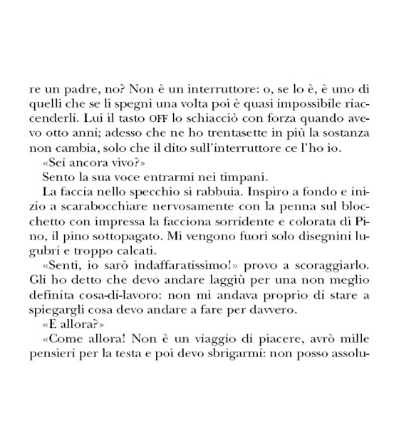 Il secondo è quello che sta fra realtà e finzione, quello che divide il fatto dalla sua interpretazione. Il terzo è costituito dalla distanza, che impedisce il dialogo, il contatto, il conforto. Raccolti insieme, questi limiti vanno a formare un sistema di frontiere e dogane, come in una carta geografica: insieme, costituiscono la mappa di un dolore perfetto.