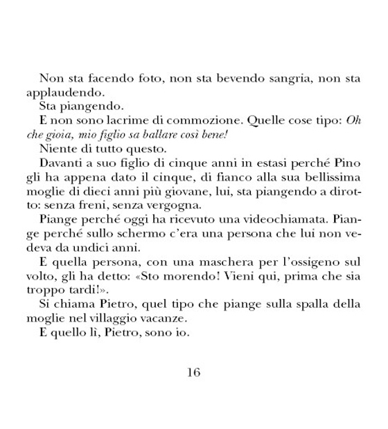Il libro di Enrico Galiano inizia con una telefonata. Pietro, professore universitario di mezz’età, è in vacanza con moglie e figlio quando riceve la notizia: deve partire per Tenerife, e deve farlo in fretta.