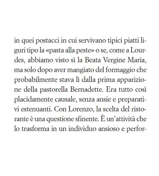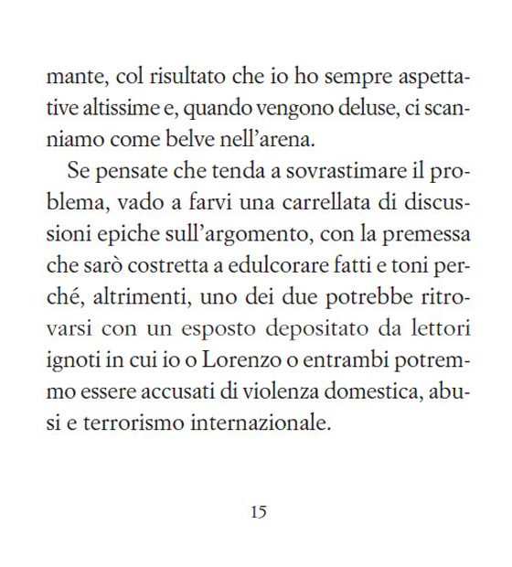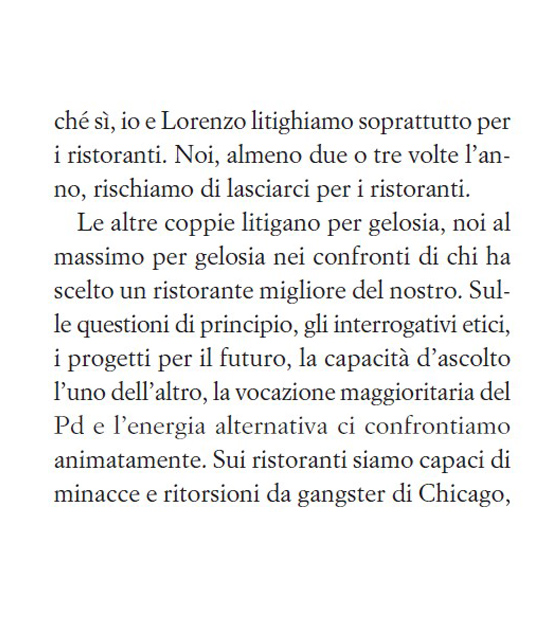 Le altre coppie litigano per gelosia, noi al massimo per gelosia nei confronti di chi ha scelto un ristorante migliore del nostro. Sulle questioni di principio, gli interrogativi etici, i progetti per il futuro, la capacità d’ascolto l’uno dell’altro, la vocazione maggioritaria del Pd e l’energia alternativa ci confrontiamo animatamente. Sui ristoranti siamo capaci di minacce e ritorsioni da gangster di Chicago, […]