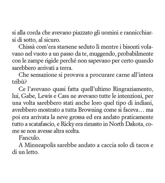 Ce l’avevano quasi fatta quell’ultimo Ringraziamento. Lui, Gabe, Lewis e Cass ne avevano tutte le intenzioni. Per una volta sarebbero stati anche loro quel tipo di indiani; avrebbero mostrato a tutta Browning come si faceva… ma poi era arrivata la neve grossa ed era andato praticamente tutto a catafascio