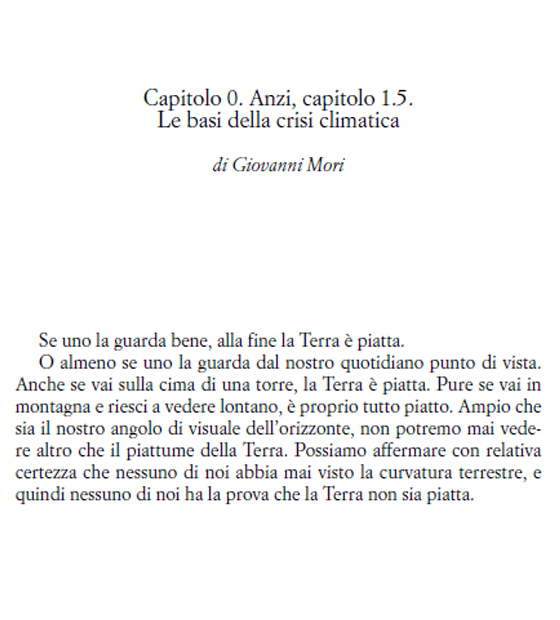 Non mi dilungherò su temi che ormai conosciamo – anche perché, meglio di quanto possa farlo io, lo fa il libro –, come la temperatura da non superare per continuare a condurre una vita decente su questo pianeta, o quanto siamo indietro, noi mondo occidentale, nella corsa agli obiettivi degli accordi internazionali sul clima. Peraltro è facile, quando ci si avvicina a testi come questo, per alcuni non addetti ai lavori, sbuffare e alzare gli occhi: cos’altro di catastrofico mi si potrà mai dire che già non so? E invece, uno dei pregi di questa guida, è proprio di farci entrare in testa il fatto che siamo tutti addetti ai lavori. Non c’è qualcuno che può esimersi da questa corsa, e se ancora siamo un po’ confusi su cosa fare in proposito, be’, alcune idee sono tra queste pagine.
