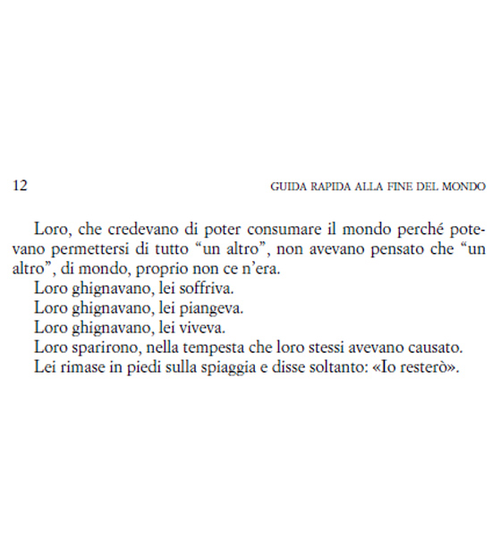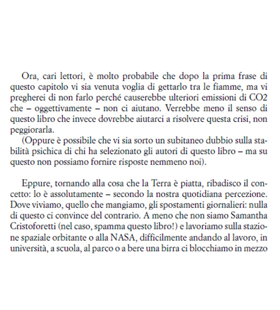 Quindi, questo libro non fa altro che dirci che la fine del mondo è prossima. Nient’affatto, non fraintendete. Per due ragioni, in sostanza. La prima, è che la guida ci rassicura spesso con delle soluzioni, che esistono e volutamente non sono scritte nella mia recensione. Sono proposte buone, realizzabili, tutto sta, appunto, nel volerle realizzare. La seconda ragione è che il mondo non finirà sia che stiamo sotto la soglia dei 2° – quando il cambiamento climatico sarà irreversibile e distruttivo – sia che la superiamo, anche di molto. Non sarebbe in ogni caso il mondo a finire, saremmo soltanto noi.