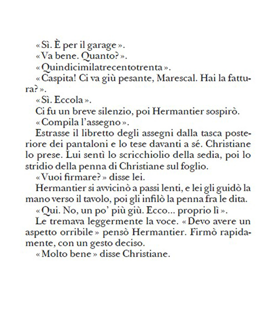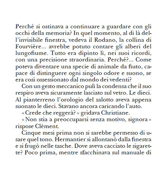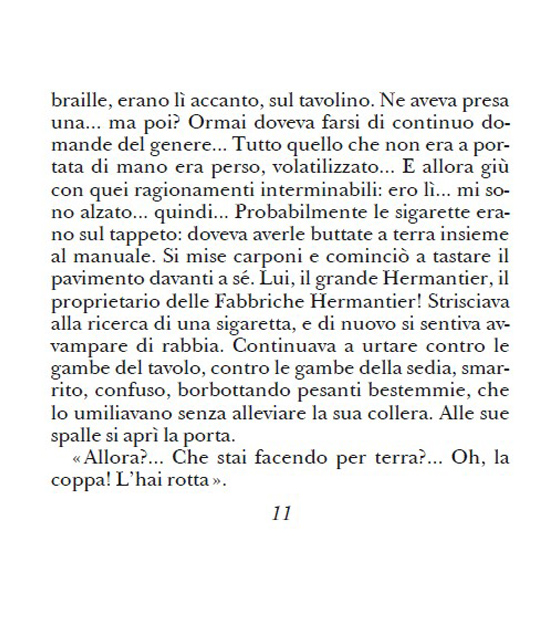Perde così il controllo sulle cose. Perde la chiarezza, perde i contorni: nulla è mai stato così fuori posto, fuori fuoco. E comincia a innescarsi il sospetto. Un sospetto che coinvolge tutti, da sua moglie al suo più caro amico, dai collaboratori agli oggetti. C’è un passaggio in cui, nel forte bisogno di una rivendicazione di autonomia, Hermantier prova a scrivere una lettera, ma come si fa a scrivere non sapendo se si sta andando fuori dalle righe? Se una parola ha preso il posto di un’altra, se si è sovrascritta? Soprattutto, come può rivedere le sue riflessioni, se non può rileggerle?