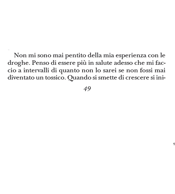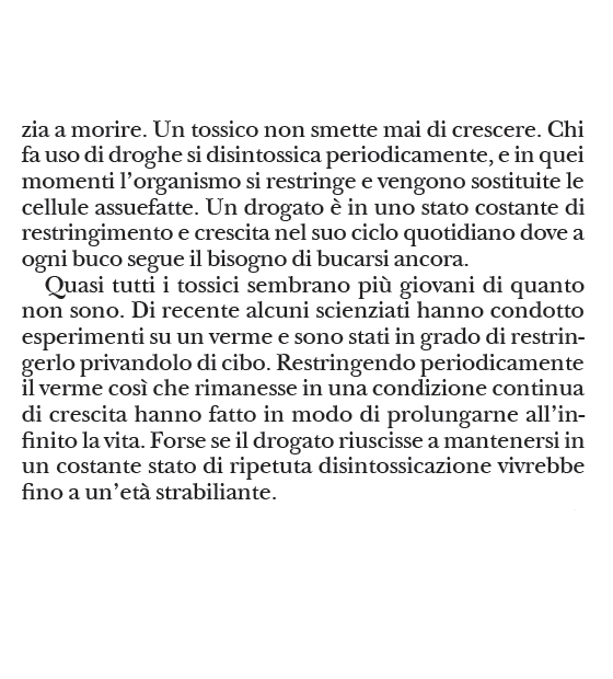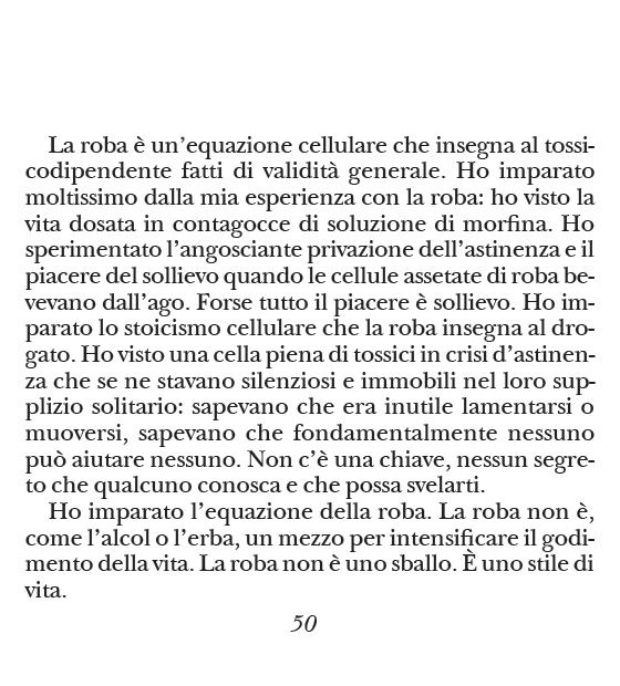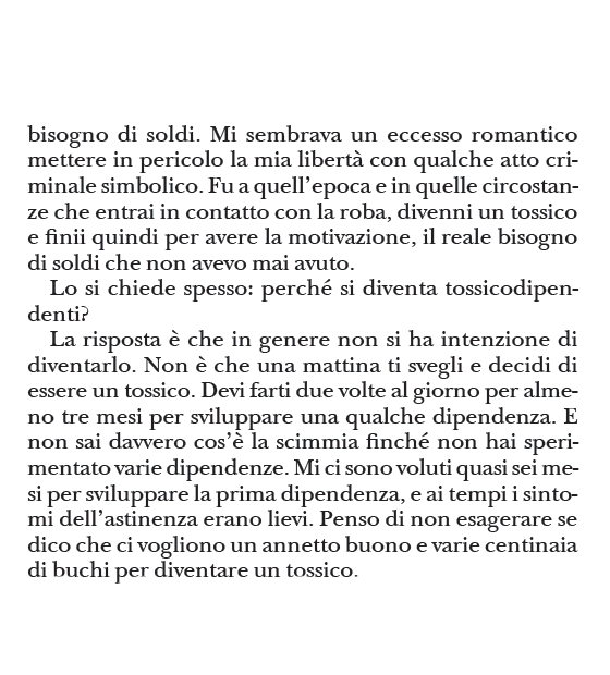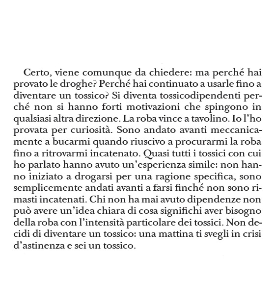 Il libro segue la vita del narratore, che inizia a usare droghe per la prima volta come studente universitario e che successivamente diventa un tossicodipendente cronico. La narrazione si concentra sulle sue esperienze come spacciatore e sulle sue avventure nella scena della droga. Il testo descrive in modo crudo e diretto la vita dei tossicodipendenti, mettendo in luce le difficoltà e i pericoli che gli stessi affrontano ogni giorno.