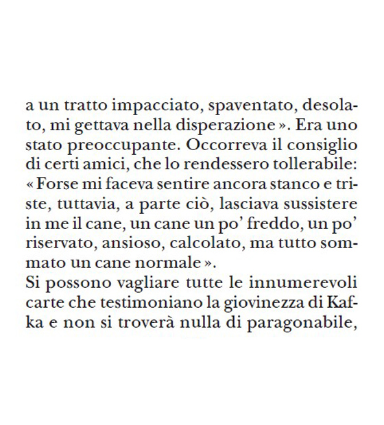 Non ha, Kafka, una tana. Cane fra i cani, ma diverso, artista che non salva, isolato ma non separato dal mondo che lo circonda. E Kafka diventa qui particolare tipo umano – antieroe, ne scrive Milena – commovente, epico nel suo schiantarsi contro una vita ai suoi occhi incomprensibile. Per lui tutto il mondo è meraviglia, cioè sempre nuovo, scoperta, luogo pieno di oggetti senza nome, ma anche esposizione, pericolo, forza incontrollata e, spesso, solitudine. È il tipo umano del narratore, che vede, legge, scruta e ancora, nonostante le sue immense biblioteche e le troppe pagine scritte, riesce a sgranare gli occhi come un bambino di fronte a una locomotiva.
