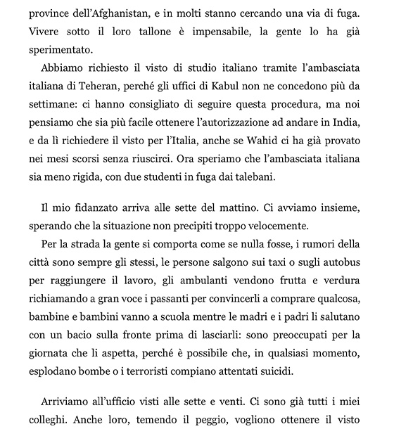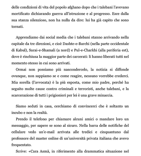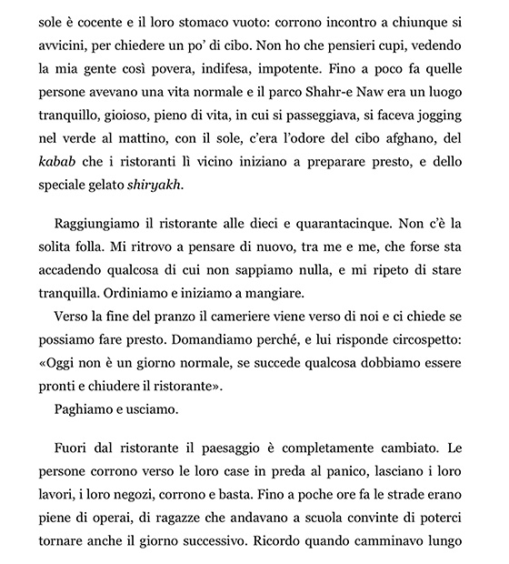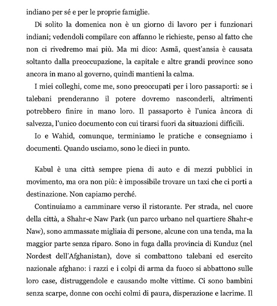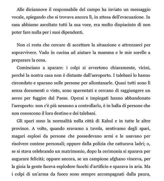 In La mia fuga da Kabul l’autrice ci racconta cinque giorni di folle travaglio, per lei sicuramente interminabili, per noi che li leggiamo con il fiato sospeso, travolgenti e dal ritmo isterico.