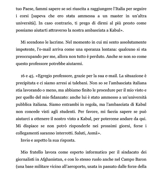 Quella della sua Afghanistan, rossa, nera e verde che è costretta a riavvolgere attorno al pennone, quella bianca talebana che invece sventola fiera nei checkpoint, macchiata dall’incubo di quei giorni interminabili, e infine il tricolore italiano, che disperata cercherà sulle uniformi dei soldati all’aeroporto pronta a gridare, sono io, sono Asmā, siete me che siete venuti a prendere.