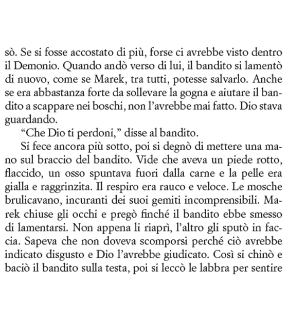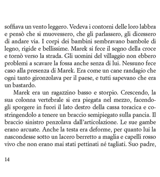 Marek era preoccupato che suo padre non andasse in paradiso. Era un uomo brusco. E quando pregava, Marek aveva l’impressione che trasudasse rabbia, che la crudeltà che si portava dentro fuoriuscisse come vapore. Non era un uomo malvagio. Ma la fede di Jude era una specie di impulso violento e non c’era niente dell’amore e della serenità che secondo Marek doveva avere