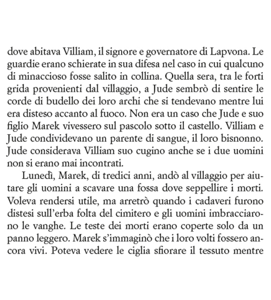 Lapvona è un villaggio medievale in cui gli abitanti soffrono la fame e i saccheggiamenti. A capo di tutto c’è Villiam (il cui gioco con il nome è presto servito, visto che, per una sola lettera, l’associazione è presto fatta con la parola inglese villain, cattivo). È un uomo riprovevole, che non ha mai conosciuto la maturità, ma incarna perfettamente l’ingordigia della ricchezza non lavorata, l’emblema di un personaggio oscuro per antonomasia – in realtà un uomo viscido e puerile, banale nella sua pochezza. Anche perché qui la vicenda vera la porta avanti Marek, un ragazzino di tredici anni che sembra essere ispirato a Quasimodo di Victor Hugo. Orfano di madre, vive con un padre, Jude (anch’egli con un nome che rievoca, questa volta un ingombrante personaggio biblico), allevatore di agnelli, ma che dell’anima del pastore ha nulla. Non guida, ma giudica, sevizia, non comprende, demonizza. Ma Marek è convinto che l’unico modo per esistere sia attraverso la punizione e che, in essa, Dio possa elevare le anime che lo meritano, pentite e prive di qualsivoglia pulsione. L’unica che sembra prendersi in qualche modo cura del ragazzo è Ina, una donna anziana, eterna forse, che lo ascolta e lo capisce e che, più di tutti, nella sua cecità sembra essere l’unica in grado di vedere.