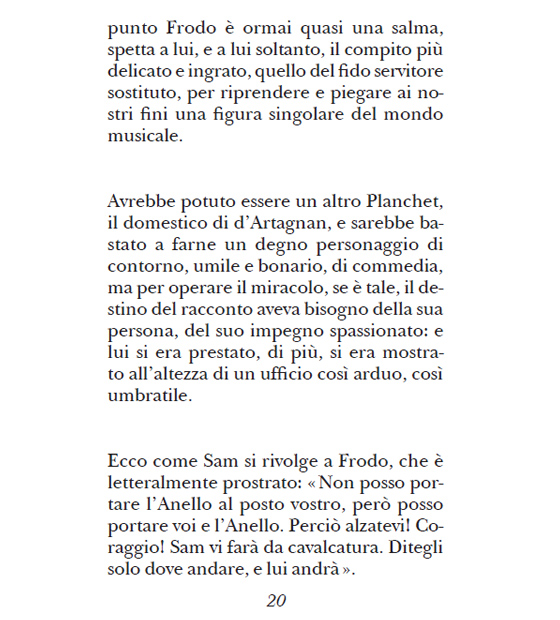 Fatica tratteggia con saggezza il ruolo di Sam nella missione che porterà alla distruzione dell’anello del Signore Oscuro. Un ruolo in apparenza gregario, il prode scudiero del protagonista. Eppure, senza la guida di Sam, Frodo non sarebbe mai riuscito a raggiungere il Monte Fato e dare fine al regno di Sauron. Sam ha tracciato la strada, gli ha offerto tutto il sostegno di cui aveva bisogno, e raggiunta la meta ha fatto un passo indietro perché fosse il suo padrone a compiere il destino che gli era stato assegnato.