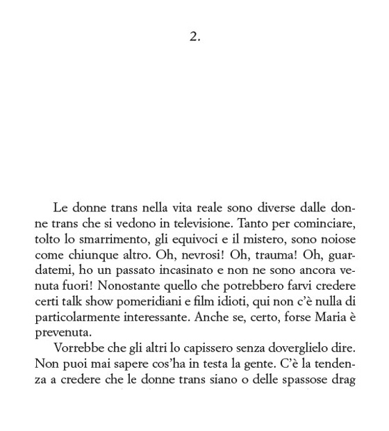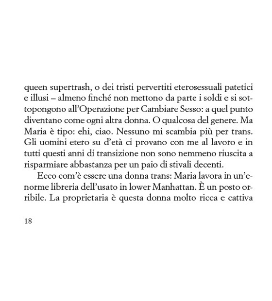Nel libro, a nessuno frega niente che Maria sia una donna trans. A lei importa molto, invece, perché dovrebbe sentirsi parte di una comunità, perché vorrebbe avere una passera come quella della sua ragazza Steph e invece ha un pacco che deve nascondere come può, e perché, nonostante tutto quello che ha passato, non è così appagata dalla persona che è diventata. Non che pensasse che una volta fatta la transizione tutto si sarebbe risolto, eppure questo suo disallineamento tra chi è e chi vorrebbe essere diventa per lei un vero dramma.
