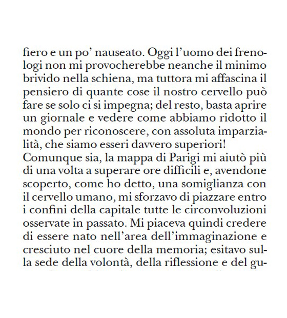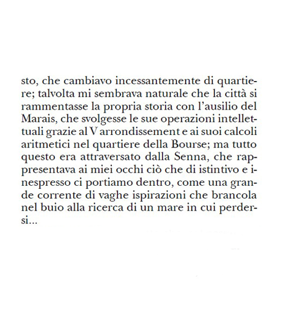 Nel camminare sotto la volta buia, tra colonne la cui simmetria, per un bizzarro effetto ottico, non riuscivo a cogliere, ebbi l’impressione di penetrare in un bosco incantato e di lasciarmi alle spalle la vita di tutti i giorni, perché uno dei privilegi di Parigi, una delle sue grazie più rare, concessa solo a chi sa perderci tempo, è proprio questo suo mostrarsi all’improvviso in una veste insolita, suscitando il piacere dell’imprevisto ma insieme anche una sottile inquietudine pronta, alla minima occasione, a trasformarsi in angoscia.