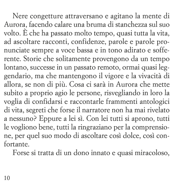 Talvolta stanca di ascoltare accuse e pettegolezzi di questo o quel fratello o anche della madre, Aurora si isola in un silenzio che non conosce via di uscita perché sarebbe anche opportuno ascoltare consigli e cercare di lasciare andare tutto ciò che non ha più senso di esistere, se ancorato ad un passato ormai lontano.