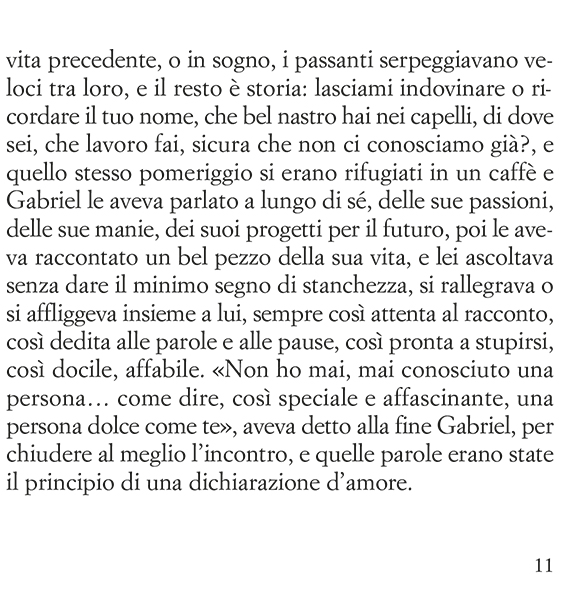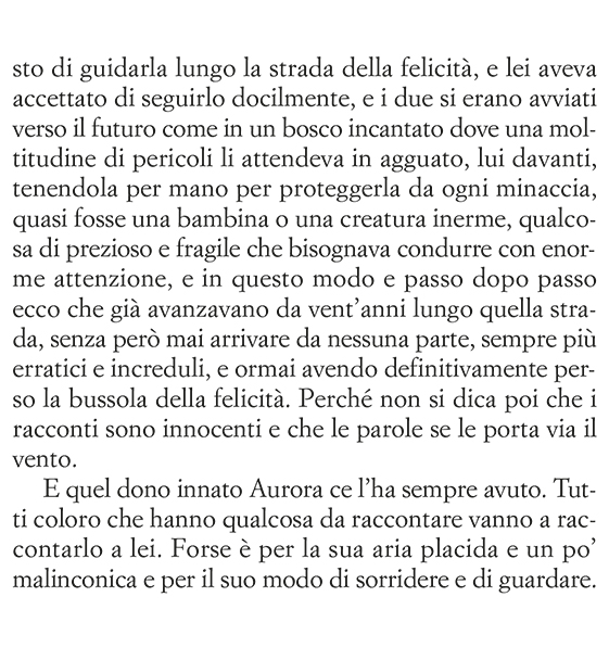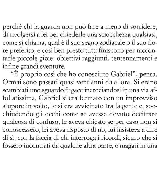 "Ho bisogno di parlarti, ho delle cose bellissime da raccontarti", riesce a dire Gabriel, con tono enfatico nella voce. "Certo, come no" dice Aurora, e si crea un silenzio ormai definitivo, che non esige nemmeno la chiusura di un saluto.