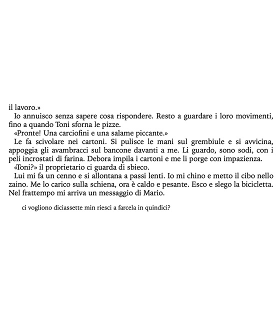 Gli articoli di filosofia che Chiara sfoglia sullo smartphone adesso sono interrotti dai messaggi di Mario, di cui non conosce il volto né la voce, ma che tramite l’app gestisce la sua giornata lavorativa.