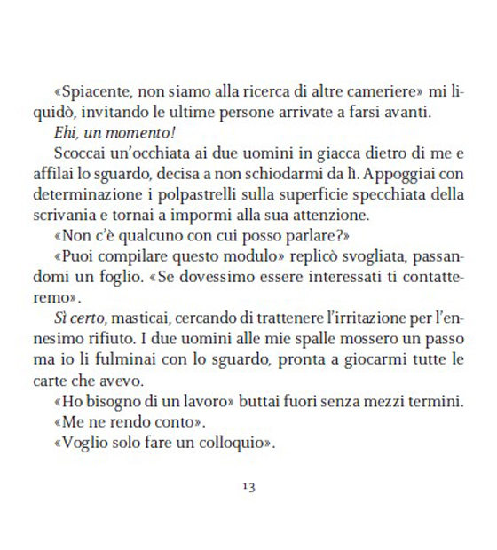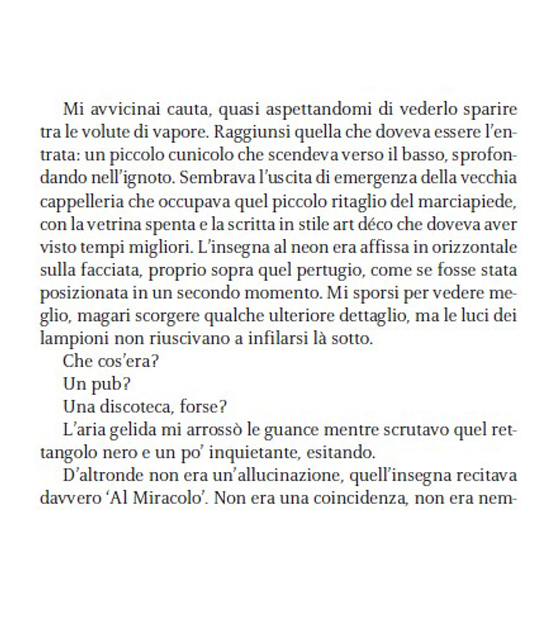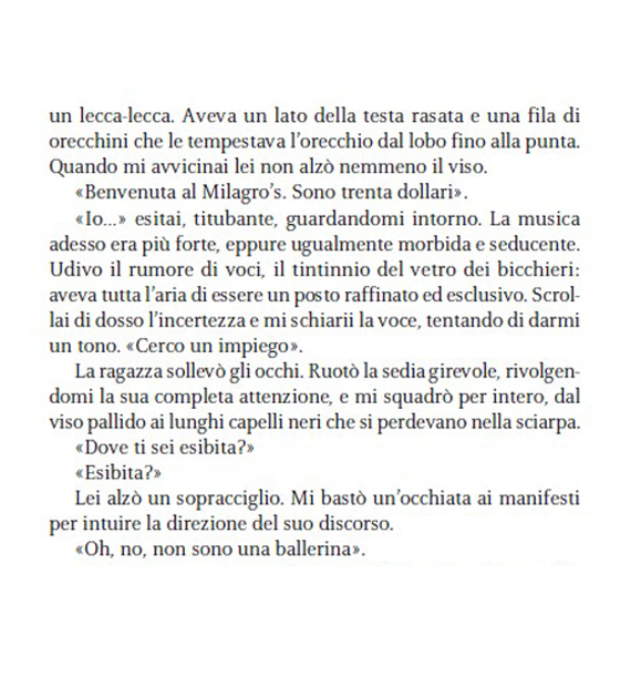 Perché l’amore non è qualcosa di definito. Tutti sanno che cos’è, ma nessuno conosce davvero i suoi confini. Per qualcuno è un sapore. Per altri, un profumo. Per me, l’amore era una cicatrice ricurva sulla pelle, in un punto preciso sotto il costato sinistro. Era uno squarcio bianco che non sarebbe guarito mai. La metà di un cuore non finito. E io l’avrei sempre portata addosso. Come uno stigma
